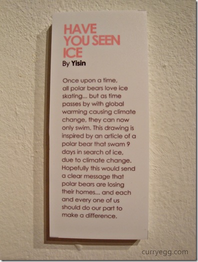 The message which Yi Sin want to send out is our polar bears are enduring the global warming effect. Their habitat is affected. The article stated that it took 9 days for a polar bear to search for ice – which is an alarming message to all of us.